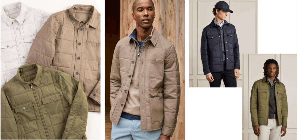 A proven style that has an outdoorsy feel and has seen a big resurgence as a Client favorite of late. Inspired by utilitarian workwear and heritage outdoor styles, the quad quilted shirt jacket delivers lightweight warmth, everyday function, and a structured yet relaxed silhouette. Constructed from our advanced Eco Tech fabric, it provides water- and wind-resistant protection, while the subtle quad quilting offers insulation without the bulk. As part of the styling update, we have added the patch pocket option both on regular and quilted shirt jackets, which leans into its utilitarian origins known as Barn Jacket or Chore jacket styling. No matter how you style it for Clients, the quilted shirt jacket is designed to be worn as an outer layer or mid-layer, it’s a versatile piece for transitional weather and casual layering. The Quad Quilted Vest (sku suffix QV, i.e., ECO5-QV) |