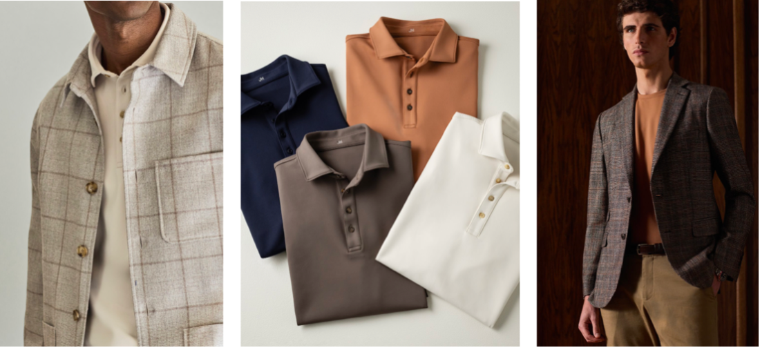 Our Scuba knit was introduced last year, and since its introduction, Clients have been loving the unique look and feel of this tech-derived knit. As a double layer, it is designed for warmth with a little more structure and a clean, modern appearance that makes colors look rich. We have added a slightly lighter version this season, aptly named Scuba Light, which we introduced for the specific layering needs of polos, something that the original version was too heavy for. The colors are similar between the two but slightly different shades, and I love how modern they look, worn back to this season’s collection. The original weight has been extended into the Hybrid Blazer, offering a relaxed style.